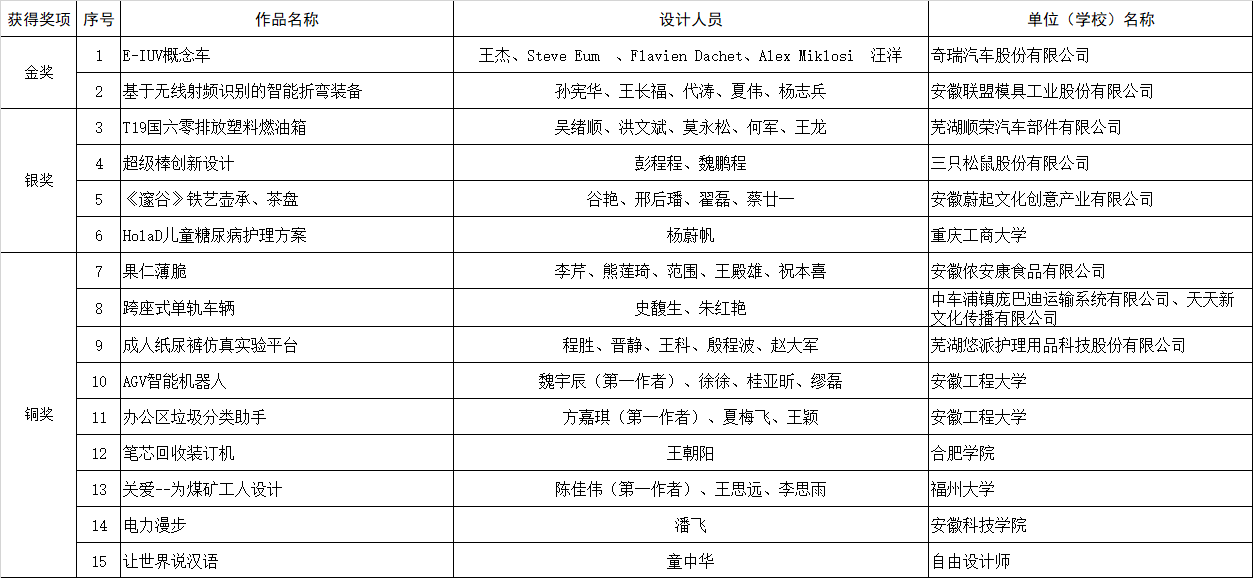 最終,來(lái)自奇瑞汽車(chē)的E-IUV概念車(chē)(概念設(shè)計(jì))與安徽聯(lián)盟模具工業(yè)有限公司的基于無(wú)線射頻識(shí)別的智能折彎裝備( 實(shí)物產(chǎn)品)榮獲本次大賽金獎(jiǎng),從設(shè)計(jì)理念、產(chǎn)品外形、先進(jìn)技術(shù)在產(chǎn)品中的應(yīng)用以及解決行業(yè)痛點(diǎn)等關(guān)鍵問(wèn)題上,以上作品在行業(yè)中均處于領(lǐng)先水平。同時(shí),來(lái)自順榮股份、三只松鼠、美的冰箱、中車(chē)龐巴迪(蕪湖)、安徽工程大學(xué)、安徽工業(yè)大學(xué)等企業(yè)、高校投稿作品也在本次大賽中取得了優(yōu)異的成績(jī)。