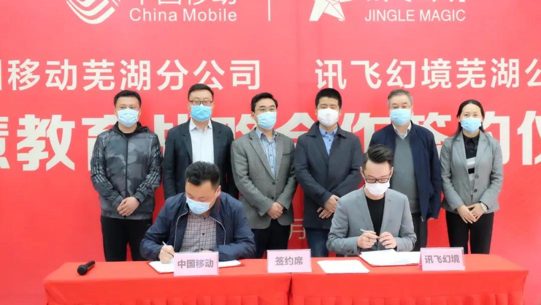 鏡湖區(qū)副區(qū)長束曉偉及政府領(lǐng)導(dǎo)、相關(guān)單位負(fù)責(zé)人,訊飛幻境政企事業(yè)部執(zhí)行總裁李寧、中國移動蕪湖分公司總經(jīng)理?xiàng)钫鸬瘸鱿⒁娮C簽約儀式,共同為雙方“智慧教育合作基地”揭牌。