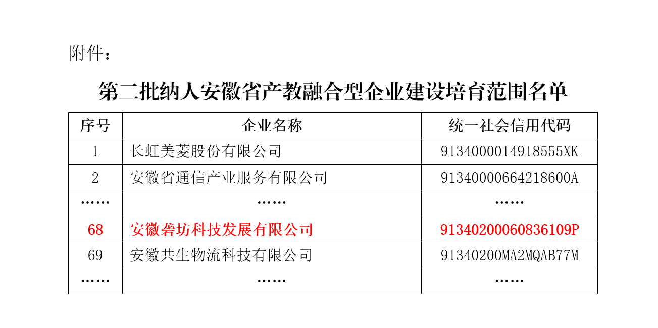 近期,省發(fā)展改革委、省教育廳、省人力資源社會保障廳公布第二批安徽省產(chǎn)教融合型企業(yè)建設(shè)培育范圍名單,安徽礱坊科技發(fā)展有限公司成功入選。